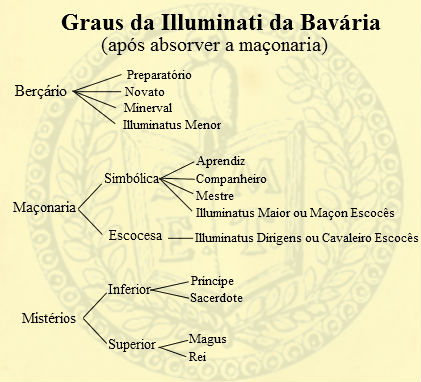 A Illuminati da Baviera foi originalmente composta por três graus iniciais: Novato, Minerval, e Iluminado Minerval. Cada grau foi concebido para atingir objetivos específicos, garantindo simultaneamente o controle completo e dominação para o ápice da pirâmide. Aqui está um breve resumo de cada grau.Novato