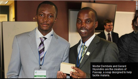 Dois estudantes de Burkina Faso desenvolveram um sabonete de ervas capaz de diminuir o número de casos de malária. O produto recebeu o nome de Faso Soap – e, mesmo depois do banho, as substâncias do sabonete permanecem misturadas na água, matando as larvas dos mosquitos mais resistentes e aquelas que podem se desenvolver nos canais ou nas proximidades da rede de esgotos.