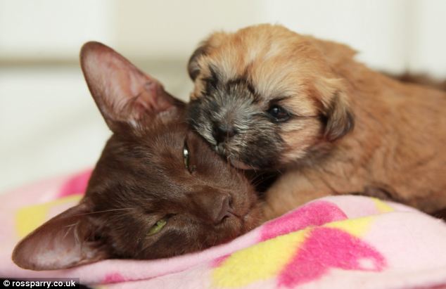 O filhote da raça Shih Tzu, que recebeu o nome de Hope (esperança, em inglês), vai ficar sob os cuidados da gata até parar de mamar.